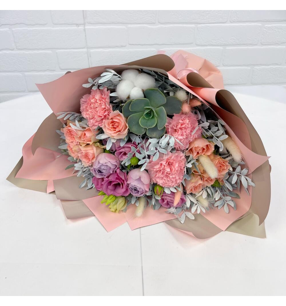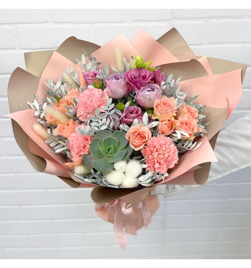 Авторский букет. Суккулент.Кустовые пионовидные розы